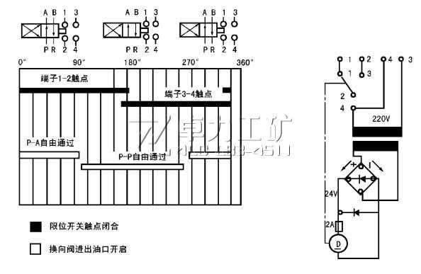 24EJF-P型(原SA-V 型)二位四通換向閥是一種采用直流電機(jī)驅(qū)動閥芯移動,以開閉供油管道或轉(zhuǎn)換供油方向的一種集成化的換向控制裝置;即使在惡劣的工作條件下(如低溫或高粘度油脂),動作仍相當(dāng)可靠。